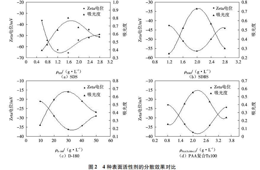 图2为pH=7的条件下,CNFs(质量浓度0.05g/L)悬浮液的Zeta电位及吸光度随表面活性剂浓度的变化情况.由于4种表面活性剂中,SDS与SDBS均为阴离子型表面活性剂,D-180、PAA和Tx100虽为高分子聚合物,但在分散过程中均可电离出阴离子,故悬浮液中CNFs表面的Zeta电位均为负值.从Zeta电位曲线来看,4种悬浮液的Zeta电位绝对值均随表面活性剂浓度的增加而呈现先增大后减小的趋势,期间出现明显峰值.从吸光度曲线来看,4种悬浮液的吸光度曲线也随表面活性剂浓度的增加而先增大后减小,同样存在明显的峰值.综合分析2条曲线可以得出4种表面活性剂的最佳分散浓度:SDS的最佳分散浓度为1.6~g/L,SDBS的最佳分散浓度为2.0~g/L,D-180的最佳分散浓度为30 g/L,PAA复合Tx 100的最佳分散浓度为2.0~g/L.通过横向对比4幅曲线图,可以比较4种表面活性剂在各自最佳分散浓度下对CNFs的分散效果.SDS在最佳分散浓度下得到的CNFs悬浮液Zeta电位绝对值达到60 mV,吸光度达到0.80,均高于其他3种表面活性剂,说明SDS的分散性能最好,形成的CNFs悬浮液稳定性最高.SDBS的分散效果次之,在最佳分散浓度下,CNFs悬浮液的Zeta电位绝对值为56 mV,吸光度达到0.75.再次是D-180,在其最佳浓度下,悬浮液的Zeta电位绝对值为37 mV,吸光度为0.67.分散效果最差的为PAA复合Tx100,所得的CNFs悬浮液的Zeta电位绝对值为38mV,吸光度仅为0.55.