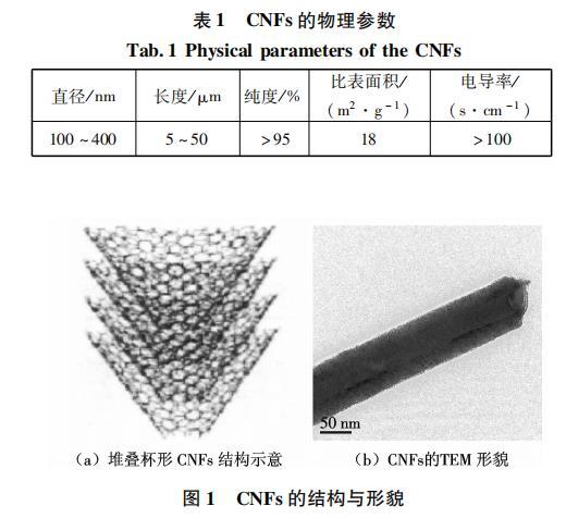CNFs购自北京博特万德有限公司,其物理参数如表1所示,其微观结构及形貌如图1所示.SDS(白色针棒状颗粒,AR)购自天津科密欧化学试剂研发中心;PAA(无色液体,AR)购自天津大茂化学试剂厂;Tx100(淡黄色黏稠液体,AR)购自天津大茂化学试剂厂;D-180(乳白色高黏稠液体)由德国毕克公司提供;SDBS(白色粉末,AR)购自天津科密欧化学试剂研发中心.