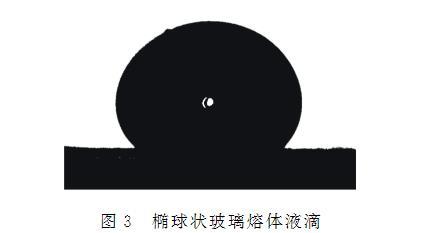 将制备的玻璃样块用锡纸包裹,用铁锤捶碎后用钳子修整成较方正的颗粒,选取内部无气泡结石且质量为0.15~0.30g的碎块用于测试。测试前选用T4温度表面张力为334 mN/m的标准钠钙玻璃校准表面张力测量仪。测试的具体操作步骤如下:将表面张力测量仪加热炉升温至测量温度,通入高纯氮气作为保护气体,然后将制备好的玻璃样品置于石墨片上,送入加热炉中的样品台上进行保温,试样在表面张力作用下收缩成椭球状液滴,如图3所示,将液滴置于拍摄装置视野中心,保温30 min至熔体稳定。随后,用图像采集装置获取椭球熔体的外轮廓线,通过软件数值分析得到轮廓参数,利用Young-Laplace方程进行解析,计算出样品的表面张力(σ),反复测试若干次后取σ的平均值为样品在该测试条件下的表面张力值。