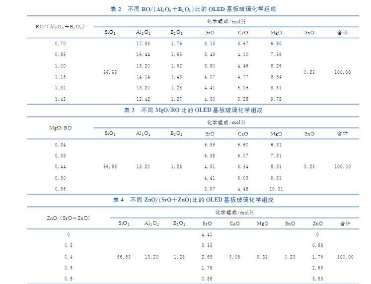根据开发需求,本文设计了四组不同化学组成的OLED基板玻璃。如表1~表4所示,分别通过改变组成中的Al₂O₃/SiO₂、RO/(Al₂O₃+B₂O₃)、MgO/RO和ZnO/(SrO+ZnO),研究表面惰性组分和表面活性组分的相对含量,以及同碱土金属氧化物网络作用相似但活性更强的过渡金属氧化物对无碱铝硅酸盐玻璃表面张力的影响。