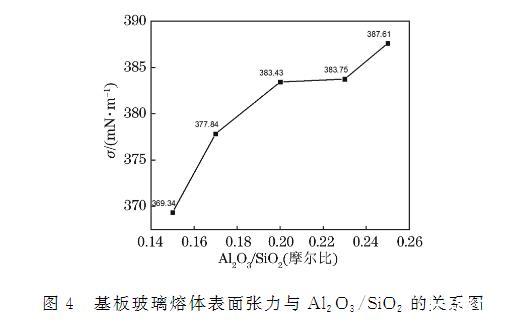 随着OLED基板玻璃化学组成中Al₂O₃/SiO₂摩尔比从0.15变到0.25,玻璃熔体在T4温度条件下的表面张力测试结果如图4所示。