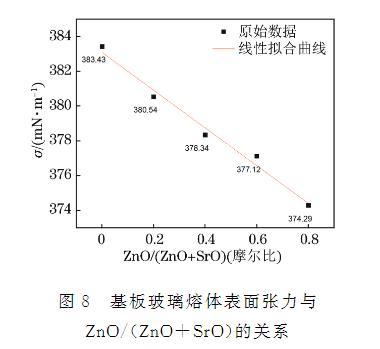 图8 基板玻璃熔体表面张力与ZnO/(ZnO+SrO)的关系