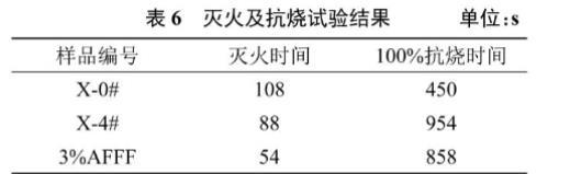 X-4#样品泡沫具有高泡沫稳定性,在以下研究中,着重研究X-4#与X-0#、3%AFFF相比的灭火及抗烧性能,测得的灭火时间及100%抗烧时间见表6。根据GB 15308—2006规定,灭火时间小于180 s,抗烧时间高于600s的泡沫被认为具有成为消防泡沫灭火剂的潜力,X-4#样品灭火时间88s、抗烧时间954 s,抗烧时间优于3%AFFF,灭火时间比3%AFFF略高,但满足消防用泡沫灭火剂性能要求,具有良好的消防灭火应用潜力。