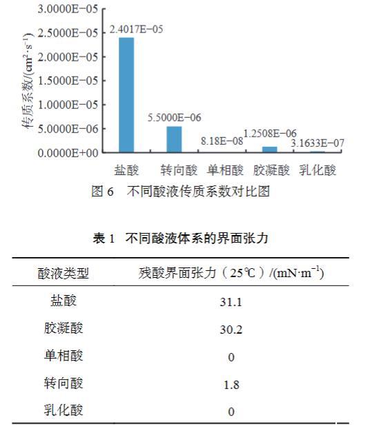 以盐酸、胶凝酸、转向酸和乳化酸为对比,测定不同酸液体系传质系数,实验结果见图6。单相酸体系缓速效果最强,比乳化酸体系还下降了一个数量级,缓速率为99.6%,可以达到缓速深部酸化的效果。单相酸相比于乳化酸酸岩反应速度明显下降,这与乳化酸粒径研究结论也是相似的:粒径越小,酸岩反应速度越慢。