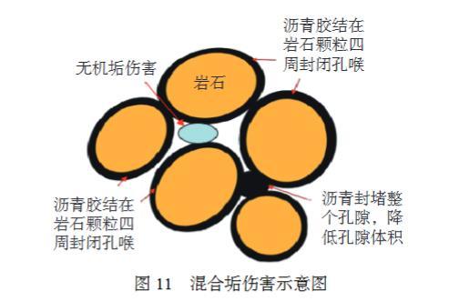 通过观察伤害后岩心表面,可以发现沥青在孔隙系统中的分布模式如图11所示。对于孔隙系统来说,沥青胶结在岩石颗粒四周,这类沥青可能对减小孔隙体积作用不明显,但其可以显著限制或封闭孔喉,导致渗透率下降;另一种充填在孔隙内,堵塞整个孔隙,降低孔隙体积。储层中的沥青占据储层的部分储集空间,破坏储层孔隙结构,不仅会减小储层的孔隙度,同时还会大幅度减低储层渗透率,严重影响储层物性及油气井产能。