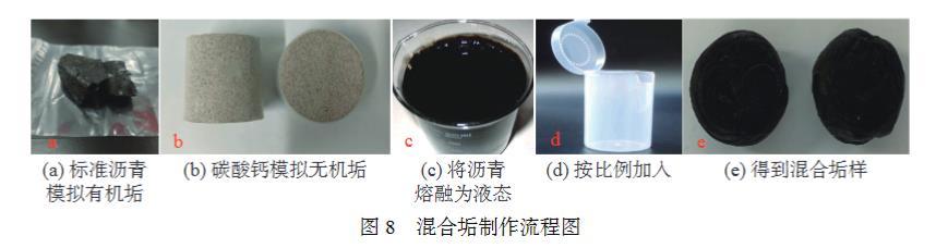 采用沥青块模拟有机垢,碳酸钙(灰岩)模拟无机垢,沥青和碳酸钙3∶7混合物模拟混合垢。混合垢样制作步骤如下:①将沥青块敲成小块放入烧杯;②控温磁力搅拌器将沥青融化为液态;③将液态沥青趁热导入塑料试管中;④再按比例加入碳酸钙,在沥青凝固前搅拌均匀;⑤得到比表面积接近混合垢(沥青碳酸钙质量比为3∶7),混合垢制作流程图见图8。
