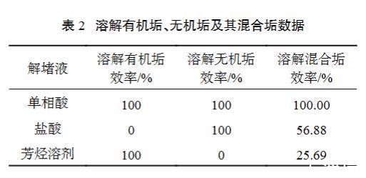 1.针对近井地带存在的有机、无机及其混合垢伤害,开发了一种新型多功能解堵体系-单相酸体系。该单相酸体系由芳烃溶剂、酸液、表面活性剂、助表面活性剂及功能型添加剂组成。
