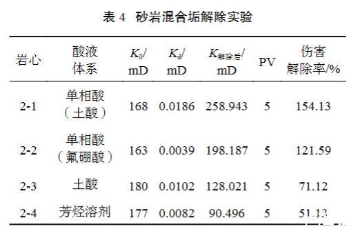 3.单相酸解堵后,岩心渗透率恢复率大于100%,表明单相酸体系不仅可以解除有机垢和无机垢伤害,还能酸蚀增渗,改善近井区域岩石渗流特性。