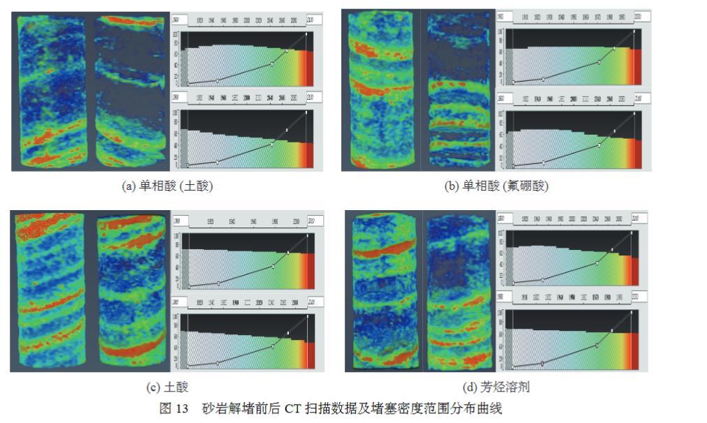 图13砂岩解堵前后CT扫描数据及堵塞密度范围分布曲线