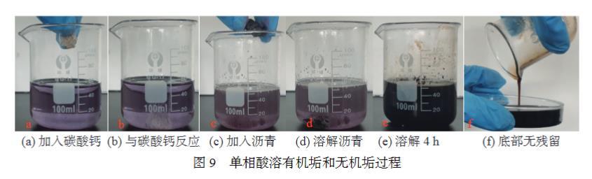 分别对盐酸、芳烃溶剂、单相酸溶解有机垢、无机垢及其混合垢性能进行测试。实验条件:90℃水浴,50 g溶液,2.5 g垢样,溶解4 h,实验结果见表2。从表2可以看出,单相酸对混合垢溶解效率远高于单一解堵体系,具备同时解除有机垢、无机垢及其混合垢的能力。单相酸溶有机垢和无机垢过程图片见图9,当碳酸钙加入后,单相酸与碳酸钙反应较明显;当沥青加入后,常温下溶解较慢,90℃水浴4 h后完全溶解;溶解后的残液倒出后,烧杯底部无残留,表明单相酸可以完全溶解有机垢(碳酸钙)和无机垢(沥青)。