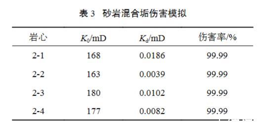 在该实验方案下,交替注入的碳酸钠溶液与氯化钙溶液会在孔隙中形成白色的碳酸钙沉淀,沥青饱和进入孔隙中经过正庚烷的挥发沥青黏度急剧增加,封堵孔隙造成渗透率下降,可以模拟混合垢伤害砂岩储层。由表3可见,获得的砂岩混合垢伤害率大于99%,伤害后岩心渗透率小于0.02 mD,伤害显著。