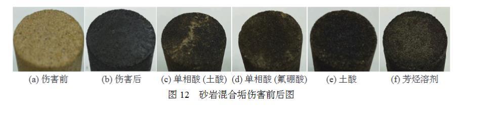 实验模拟改变单相酸的酸相(土酸、氟硼酸)与土酸和芳烃溶剂进行对比实验,实验结果见表4。岩心伤害前后及采用不同体系解堵后的岩心端面照片见图12。实验结果显示芳烃溶剂和土酸只能部分解除砂岩岩心伤害,单相酸体系不仅可以解除有机垢和无机垢伤害,还能酸蚀增渗,使得伤害解除后岩心渗透率高于伤害前岩心渗透率。