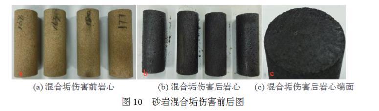 为在室内模拟混合垢岩心伤害,设计如下实验步骤:①气测岩心初始渗透率;②模拟无机垢伤害:使用10.5%碳酸钠溶液与15%氯化钙溶液交替注入,模拟无机垢(CaCO3)的损害;③模拟有机垢伤害:50%的沥青正庚烷溶液与二甲苯1∶1混合,抽真空进行岩心饱和,伤害72 h后烘干;④伤害后岩心气测渗透率;⑤计算伤害率。混合垢伤害前后砂岩岩心图片见图10。