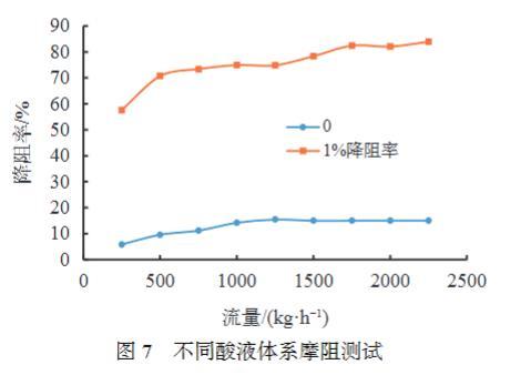 采用摩阻测试仪测定单相酸的降阻率,实验结果可以看出,在不加减阻剂的情况下,单相酸与水的摩阻相当,表明不加减阻剂情况下,单相酸不具备减阻效果;加入0.1%减阻剂后,可明显降低单相酸摩阻,降阻率可达80%以上,摩阻和胶凝酸相当,远低于乳化酸摩阻。