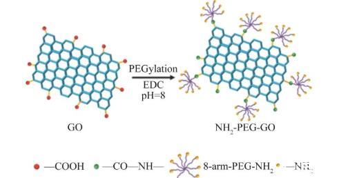 NH2-PEG-GO的制备方法:使用8-arm-PEG-NH2对GO表面进行修饰(图1)。取80 mL上述细胞破碎机处理后的GO溶液,加入16 mL质量浓度为2 mg/mL EDC来活化GO表面羧基,然后将混合溶液在功率为570 W条件下超声30 min(开1.5 s,关1 s),待分散均匀后,再用5%NaOH溶液来调节溶液酸碱性(pH=8),随后将240 mg 8-arm-PEG-NH2加入,超声反应30 min后,再常温搅拌反应12 h,离心水洗后得到氨基修饰的GO,于室温真空冷冻干燥2 d后,得到最终产物,将产物研磨备用。
