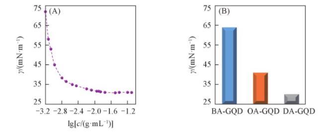 为了研究烷基链中碳原子数对表面活性的影响,按照1.2.1节方法,用丁胺和辛胺代替十二胺,分别制备了丁胺功能化石墨烯量子点(BA-GQD)和辛胺功能化石墨烯量子点(OA-GQD),并测定其最低表面张力。由图3(B)可知,DA-GQD的表面张力比BA-GQD和OA-GQD的表面张力低得多,表现出更好的表面活性。3种石墨烯量子点的主要区别在于烷基胺的碳链长度,结果表明,烷基碳链长度对石墨烯量子点的表面活性有较大影响,烷基链越长,表面活性越好。上述规律与经典的表面化学理论一致。