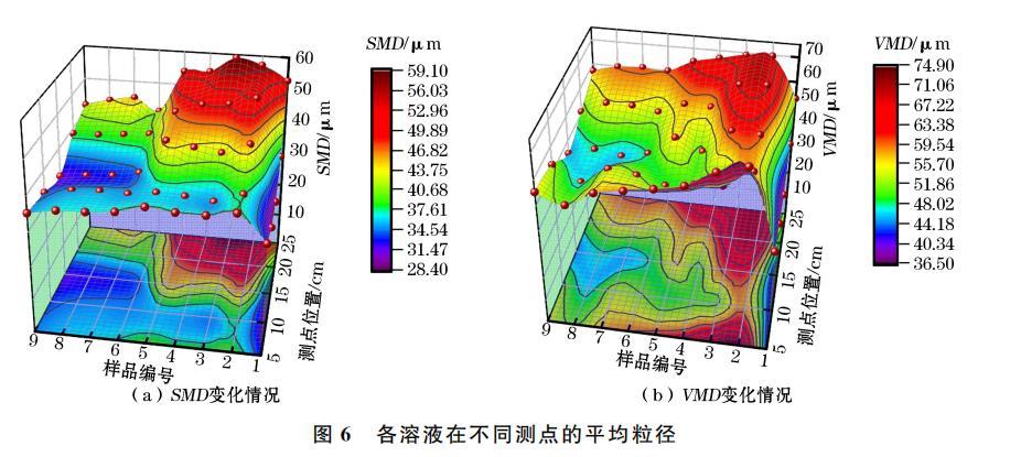 在喷雾形成过程中,空气动力相同时,表面张力对雾滴破碎的阻碍作用决定粒径分布情况,所以表面张力减小,溶液可分裂成无数尺寸细小的雾滴,其粒径随之细化。雾化是液体射出喷嘴后,受喷雾压力作用不断破碎呈雾滴的过程,因此矿井水表面张力减小后,雾滴破碎受到的抑制力减弱,雾化过程适量延长,雾化区范围随之增大。随着液体不断分裂破碎,雾滴粒径逐渐集中分布于某区间,各雾滴之间趋向均一化分布。