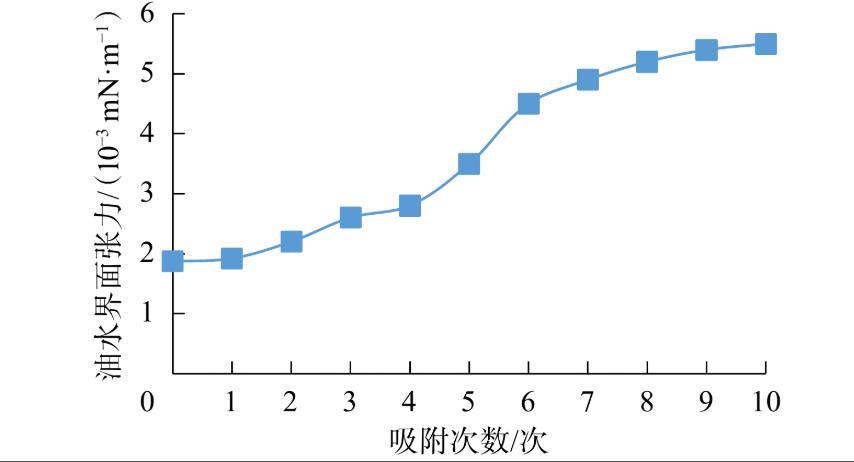 图4为使用岩心粉对质量分数为0.5%的OBU-3溶液重复进行10次吸附实验后的油水界面张力情况。从图4可看出:随着吸附次数的增加,油水界面张力增加;经过10次吸附后,油水界面张力仍在超低界面张力范围内。这说明OBU-3低黏表面活性剂体系在岩心上吸附较少,吸附多次后,在油水界面上仍足以使界面张力处于超低值,满足驱油对表面活性剂的要求。