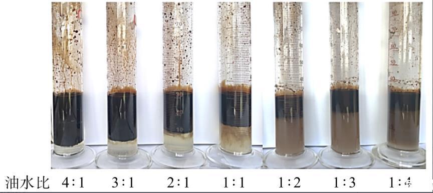 图3为在45℃放置24 h后不同油水体积比条件下OBU-3低黏表面活性剂体系对油水的乳化情况。从图3可看出,部分乳液分层严重,破乳效果较好。OBU-3对油水的乳化程度随着油水体积比的增加而减小,油水体积比为4∶1、3∶1、2∶1、1∶1时分离出的水颜色较浅,油水分离效果较好。