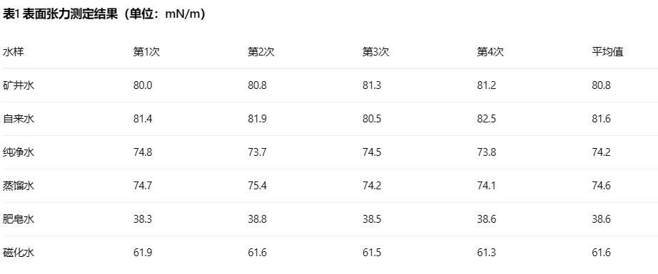 采用芬兰Kibron公司生产的Delta-8全自动高通量表面张力仪对不同种类的水在室温下进行测定,铂金环浸入到水中一定的位置,随着铂金环与水之间的膜被拉长,使铂金环受到一个向下的力,差动变压器的磁芯随铂金环的下降而上升,使差动变压器的线圈感应出一定的电压值,这样将被拉伸的薄膜变形量转化为电压量,经微机处理转化为相应的张力值,并自动显示出来。随薄膜逐渐被拉长,张力值逐渐增大,直至薄膜破裂,记下的最大值即水的实时张力。