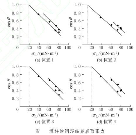 由图2可知,煤样不同位置处的临界表面张力不同,按照式(3)计算得到位置1—4的临界表面张力依次为:17.1、10.5、19.9、21.1 mN/m,分析其原因主要有2点:一是系统本身所具有的人为误差的可能;二是测点位置煤样表面粗糙度不同。因此,成庄矿煤样的总体临界表面张力取4个不同位置临界表面张力值的算术平均值为17.15mN/m。因此,凡是表面张力低于17.15 mN/m的水都能以零度接触角润湿在成庄矿煤体表面上;表面张力大于17.15 mN/m的不同种类水,表面张力越逼近该值的,其对该煤样的润湿效果越好,越有利于煤层注水。