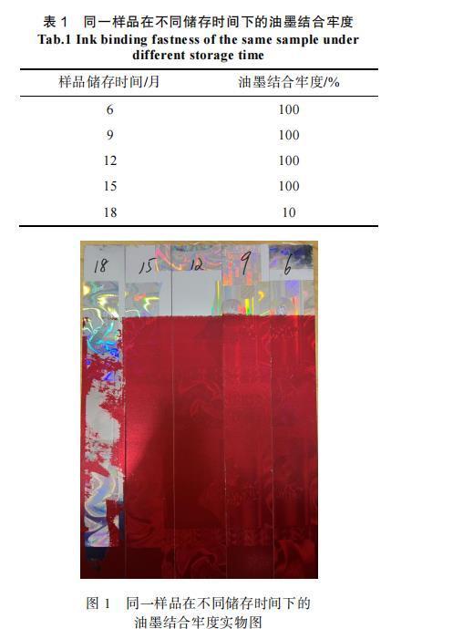 表1同一样品在不同储存时间下的油墨结合牢度