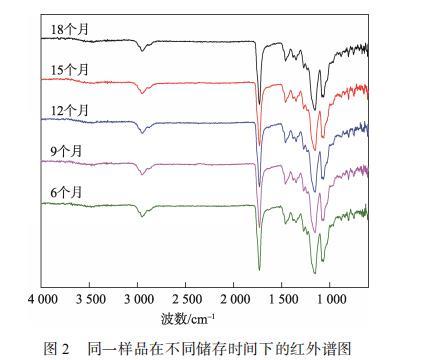 在温度为23℃、相对湿度为60%的环境下,测试样品在不同储存时间下的表面张力,测得数据见表2。由表2可知,样品转移涂层刚开始成膜时的表面张力为40 mN/m,且样品储存6个月以内的表面张力基本保持不变。7—9个月出现衰退,降低为38 mN/m,符合真空喷铝纸行业标准(BB/T 0054—2010)。储存12个月至18个月的纸样表面张力仅为36 mN/m,但并未在储存18个月时出现进一步的明显降低。显然,纸样的表面张力缓慢降低并不能解释2.1节中出现的18个月印刷油墨与转移涂层的附着力差的问题。再根据相关研究,表面张力≥38 mN/m的要求,并不直接适用于转移纸印刷的质量控制,特别是用于UV胶印的真空喷铝转移纸的转移涂层。胶印印刷适应性并不完全由表面张力所决定。