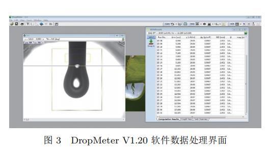 使用微量流体精准控制系统形成稳定的悬垂液滴,该系统主要由微单片机控制器、电机激励器、异步电机、星型减速机、刚性联轴器、螺纹增压泵和铝型固定件组成。通过使用较小内径的毛细管和异步电机转速的精准调控,可以实现在高压条件下稳定液滴的控制需求。经标定的毛细管外径为 1.6505 mm,不确定度为 0.0011 mm。同时,由数字相机、工业镜头、LED 背光源和 LED 光源控制器四部分组成了图像采集系统,结合宁波海曙迈时检测科技有限公司提供的 DropMeter V1.20 软件完成数据处理。图 3 为该软件的数据处理界面 DropMeter V1.20,该软件可读取液滴视频和图片文件,并能根据 Canny 算子自动检测待测液滴的基准线和外形轮廓线,通过最小二乘法实现外形轮廓的拟合和表面张力的计算,根据统计学原理给出表面张力的计算误差。悬垂液滴轮廓在通过图像分析软件进行拟合得到形状因子和顶点曲率半径时,会存在轮廓曲线拟合误差,根据 DropMeter V1.20 软件说明书可知,由软件拟合确定形状因子和顶点曲率半径所引入的相对不确定度分别为 0.05% 和 0.005%。