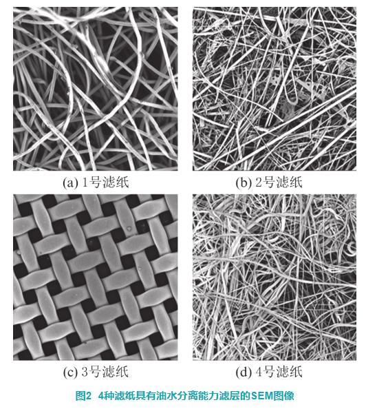 使用Phonem Pro X扫描电子显微镜(scanning electron microscope,SEM)在500倍放大倍率下拍摄的4种滤纸的微观结构如图2所示。1号滤纸由直径约为15μm的亲水纤维构成;2号滤纸的亲水层由粗细不同的纤维通过树脂粘接而成,其中粗纤维还起到增加亲水层物理强度的作用;3号滤纸由直径约为45μm的聚四氟乙烯纤维丝编制,两根纤维之间的距离约为44μm;4号滤纸的b层由疏水材料通过熔喷工艺制成,在平面上纤维分布疏密不均但在空间内有着较好的孔隙分布。除了3号滤纸外,其余滤纸均具有油水分离层,同时也具有较为复杂的空间结构。