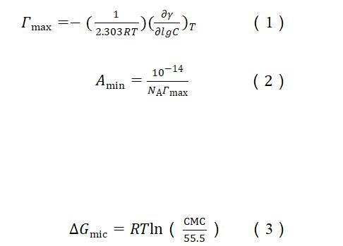 根据表面张力和浓度的关系曲线,使用吉布斯吸附等温线〔方程(1)〕计算出表面活性剂分子吸附在气液界面的最大表面过剩浓度(Гmax)。