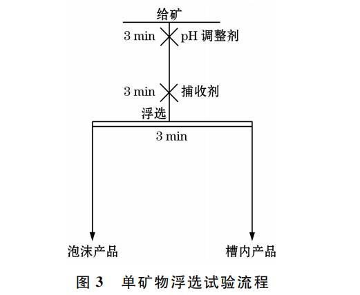 采用一次粗选的试验流程,探究十二胺(DDA)和YTDB在不同矿浆pH、不同捕收剂用量下,对石英以及赤铁矿回收率的影响。单矿物浮选试验在XFD-Ⅲ浮选机进行,在室温条件下配制矿浆,称取2.00 g的单矿物放入浮选槽中,再加入20 g去离子水,控制浮选机的搅拌速度为1900 r/min,搅拌2 min以充分搅匀矿浆。加入事先准备好的pH调整剂调浆3 min,再加入捕收剂调浆3 min后,开始刮泡,控制刮泡时间为3 min.浮选结束后,将精矿进行过滤、烘干、称重,随后计算其回收率。单矿物浮选试验流程如图3所示。