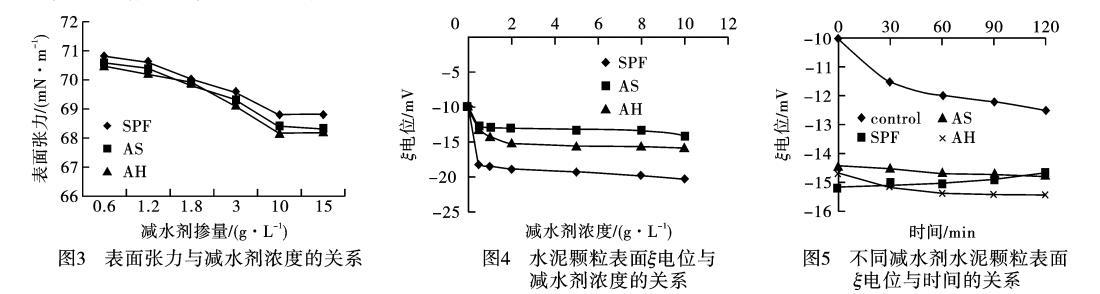 1)SPF对水泥颗粒表面电位的影响ξ电位表示水泥颗粒间静电排斥力的大小。ξ电位越大水泥颗粒间的静电斥力越大,减水剂分散作用越强。掺加不同浓度SPF、AS和AH的水泥悬浮体系的ξ电位,如图4所示。