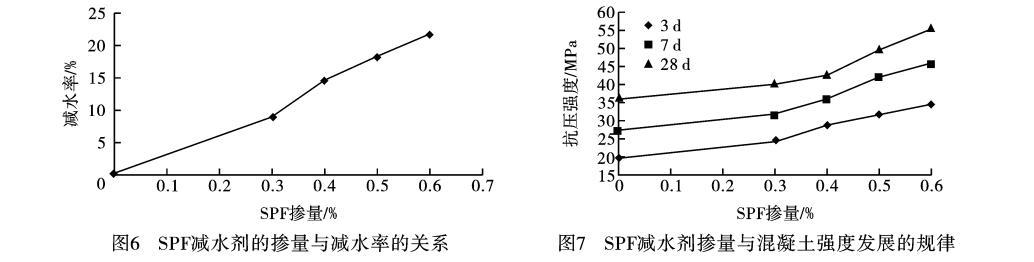 c.SPF高效减水剂应用性能研究表明,随着掺量的增大,减水率有成比例增加的趋势,低掺量下即具有较强的减水分散效果,继续增加掺量后减水率处于平缓状态。掺加SPF高效减水剂对混凝土有明显的增强作用,随着减水剂掺量的增加,不同龄期的抗压强度都在增加,同时混凝土早期强度发展很快,3d的强度可达到28d强度的60%—70%,7d强度可达到28d强度的80%—90%,混凝土后期强度也有增长的趋势。