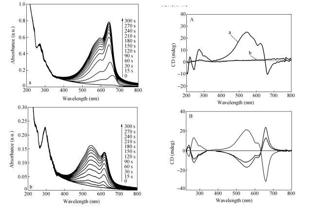 以CODA为例,随着紫外光辐照时间增加,LB膜在590和640nm处出现2个典型的聚二乙炔蓝相吸收峰,且随时间增加而逐渐增强,薄膜颜色由淡黄色变为蓝色。而对于CO2DA LB膜,随着254nm紫外光辐照时间的增加,在540和620nm处出现两个明显的吸收峰,分别对应于聚二乙炔红相和蓝相的典型吸收,薄膜颜色由淡黄色变为紫色。随着辐照时间的增加,540nm处吸收峰明显增强,聚合薄膜中聚二乙炔红相组分变多。