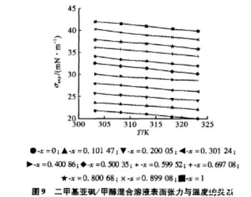 图9 二甲基亚砜/甲醇混合溶液表面张力与温度的关系