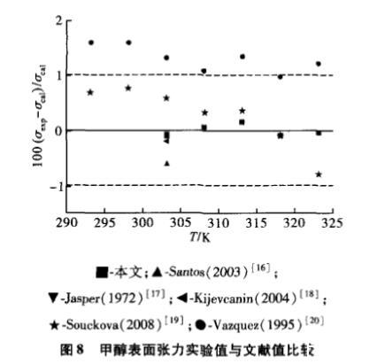 图8为甲醇表面张力实验值拟合得到的方程与文献实验值的偏差,本文数据与Santos等[15],Jasper[16],Kijevcanin等[17]和Souckova等[18]数据吻合得较好,与Vazquez等[19]数据偏差稍大,最大偏差为1.6%。