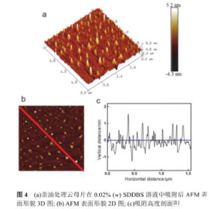 图4(a)亲油处理云母片在0.02%(w)SDDBS溶液中吸附后AFM表面形貌3D图;(b)AFM表面形貌2D图;(c)吸附高度剖面图