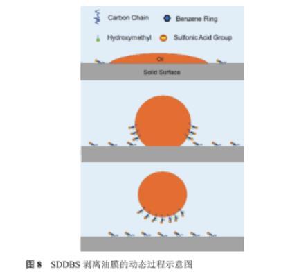 如图8所示,SDDBS剥离油膜机理可从以下三个方面进行阐释,首先SDDBS吸附在油水界面上降低了油水界面张力;其次,SDDBS的二羟基通过氢键作用强化了其与岩石表面吸附,磺酸基团富集于岩石表面使得岩石表面由亲油转变为强亲水,极大地增加了油滴在岩石表面接触角,降低粘附功而使得油膜易于剥离;最后,由于SDDBS在油水界面和岩石表面同时吸附,增加剥离后油滴与岩石表面间的静电斥力,使得剥离后油膜不易重新粘附壁面,实现高效剥离。