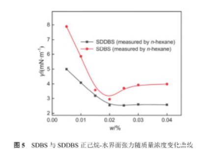 图5 SDBS与SDDBS正己烷-水界面张力随质量浓度变化曲线