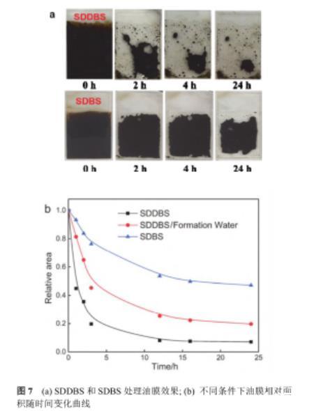 如图7a所示,经SDDBS溶液处理后,油膜面积降低明显,油膜收缩最终以油珠形式从岩石表面脱离.而经SDBS溶液处理后,油膜面积仅有少量减少,24 h后仍有大部分油膜未被有效剥离.油膜相对面积随时间的变化曲线如图7b所示,SDDBS处理后,24 h内油膜面积减小了89%(黑色曲线).而油膜在SDBS中面积仅减小约53%(蓝色曲线),说明羟基的引入有效促进了油膜剥离.使用模拟地层水(配方见表S2,见支持信息)配置0.02%(w)SDDBS溶液,以相同方法进行油膜剥离实验,得到图7b红色曲线.由图可得,地层水条件下SDDBS溶液的油膜剥离效果减弱,24 h内油膜面积减小了81%,结合前述润湿性调控与界面张力结果,盐浓度的增加虽然降低了油水界面张力,但同时使得处理后表面水下油滴接触角减小,疏油性减弱,最终导致油膜剥离效果变差,说明油固界面润湿性调控在油膜剥离中起重要作用.较于文献报道仍具有优越效果,说明制备的SDDBS具有良好的油藏环境适应性,实际应用潜力巨大.