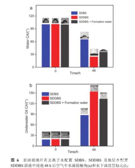 图6亲油玻璃片在去离子水配置SDBS、SDDBS及地层水配置SDDBS溶液中浸泡48 h后空气中水滴接触角(a)和水下油滴接触角(b)
