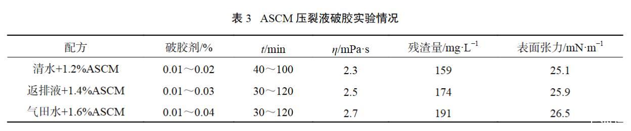 参考SY/T 5107—2016《水基压裂液性能评价方法》中的方法分别评价不同水质配制的ASCM压裂破胶液对苏里格天然岩心渗透率的伤害情况,结果如表4所示。清水配制的ASCM压裂液的岩心伤害率小于20%,气田水、返排液配制的岩心伤害率小于25%,都低于30%,满足行业标准要求。这是由于ASCM分子结构中含有一定量的DEAM,破胶时更易形成小片段的分子残链,同时残链中含有较高比例的亲水基团,水溶性较好,因此残渣少,伤害低。