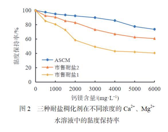 模拟苏里格气田水中Ca2+、Mg2+含量,配制钙镁总量在500~6000 mg/L的二价盐水溶液,分别评价ASCM和两种市售耐盐稠化剂的耐钙镁离子的能力,结果如图2所示。ASCM耐钙镁离子的能力明显优于另外两种耐盐稠化剂,当钙镁总量达到3000 mg/L时黏度保持率在90%左右,钙镁总量达到6000 mg/L时黏度保持率在70%以上,耐钙镁能力达到6000 mg/L。这是由于ASCM结构中的双尾疏水单体在微疏水作用下赋予聚合物分子链良好的延展性和柔韧性,促使聚合物在高盐水中快速舒展溶胀,同时含有的季铵盐阳离子、磺酸基团能够有效减弱高浓度Ca2+、Mg2+对聚合物的屏蔽作用,有利于形成更多的氢键结构,在分子链间提供更多的物理“交联位点”,保持较大的流体力学体积,提高在盐水中的增黏效果。