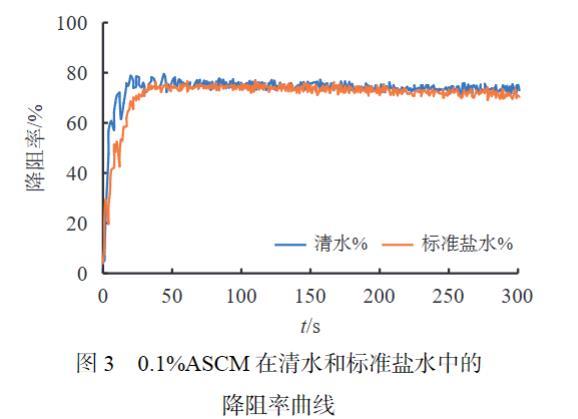 使用CDMZ-IV型管路摩阻仪模拟14 m3/min的施工排量分别测试0.1%ASCM在清水、标准盐水中的降阻性能,。