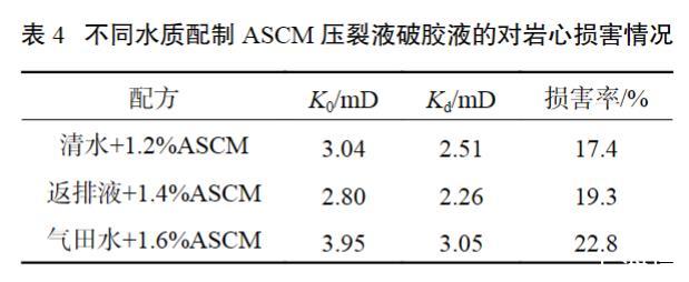 表4不同水质配制ASCM压裂液破胶液的对岩心损害情况