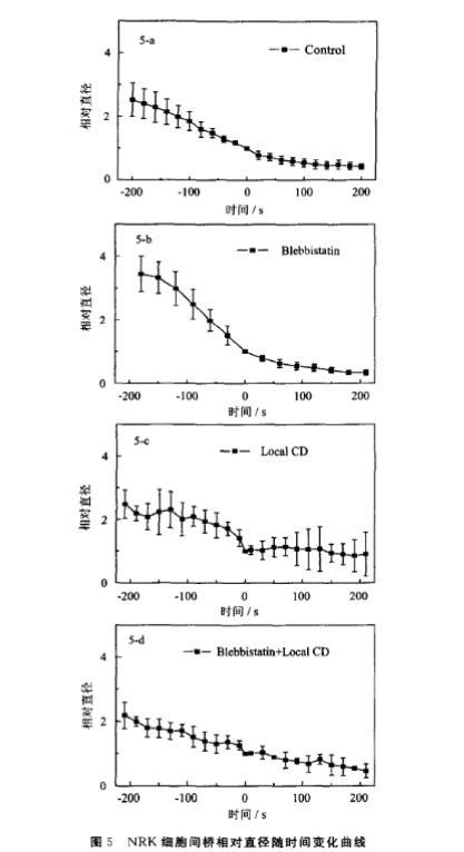 从整体施加blebbistatin的细胞组可以看出,单侧利用CD处理的实验组细胞与对照组细胞的细胞间桥变形趋势间出现了差异。在整体存在blebbistatin的状态下,同时局部利用CD处理极区皮层会导致细胞间桥变形近似一条直线(图5-d),而只采用整体blebbistatin处理的细胞在D₀点之前表现出典型的指数衰减(图5-b)。这是由于经过两种抑制剂的共同作用,在降低整体表面张力的基础上大幅降低了单侧子细胞的表面张力,使得细胞间桥变形近似于弹性松弛模型,该模型描述的是由细胞膜的粘弹性和皮层张力决定、由细胞内拉普拉斯压力差主导的细胞间桥变形,表现为线性变化。与对照组细胞单侧极区施加CD(图5-c)相比,整体施加blebbistatin并且进行抑制单侧极区肌动蛋白的细胞(图5-d)同样表现出间桥变形曲线不平滑,但是在D₀点之后并未出现一段明显的平稳期。Ren等的报道认为细胞感受和传递力学信号主要通过肌球蛋白II与肌动蛋白交联蛋白的相互作用,这与本实验的结果相符,我们认为这与低活性肌球蛋白II的ATP酶对细胞肌动蛋白网络的调节有关。