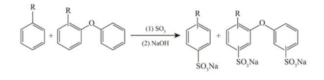 采用SO3膜式磺化工艺,改变烷基二苯醚与烷基苯的质量比,将二者混合进行磺化反应,然后用NaOH溶液中和,制得质量分数为25%的烷基二苯醚/烷基苯混合磺酸盐,反应方程式如下: