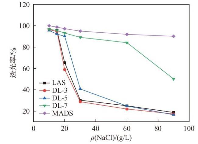 在许多工业应用中,水中含有大量的盐类,例如在石油天然气开采、海洋设备清洗或污水处理等场景中[2,7]。耐盐型表面活性剂能够保持在高盐环境下的化学稳定性,避免沉淀或失效,确保其清洗能力不受影响,因此探究表面活性剂的耐盐性有重要意义。图3给出了LAS、DL-n、MADS的耐盐性透光率图,可以看出,LAS的耐盐性最差,20 g/L NaCl时溶液浑浊,而MADS的耐盐性最好,随着混合磺酸盐中MADS含量的增加,混合磺酸盐的耐盐性呈升高趋势,说明MADS含量的提高有利于提高耐盐性,这可能是由于无机盐对阴离子表面活性剂的作用体现在离子头基水化层的破坏作用,MADS分子中的双磺酸结构电荷密度大,屏蔽了NaCl的作用。