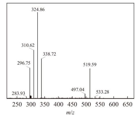 以DL-5为例,MADS的分子量M1=542,LAS为碳链C10~13的混合物,M分别是318,332,346,360。由图1质谱图可以看出,离子峰m/z=519.59为失去一个钠离子的MADS;离子峰m/z=296.75,310.62,324.86,338.72分别为失去一个钠离子的C10~13烷基苯磺酸盐,证明确为烷基二苯醚/烷基苯混合磺酸盐。