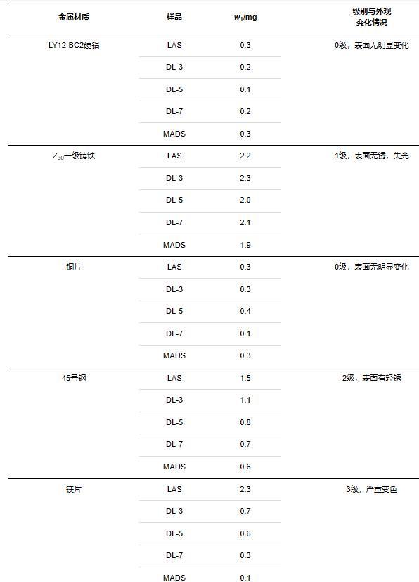 表面活性剂在使用过程中难免会接触到金属设备及容器,存在潜在的腐蚀问题[11]。本研究选用LY12-BC2硬铝、Z30一级铸铁、铜片、45号钢、镁片这5种不同的金属试片来模拟不同的金属环境,对LAS、DL-n系列、MADS表面活性剂溶液进行金属腐蚀性测试。通过观察试片外观变化以及腐蚀量计算来确定金属腐蚀性级别。